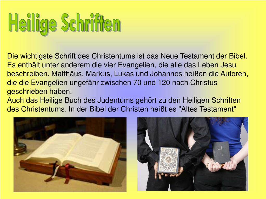 Sie besteht aus dem ersten und zweiten testament. Die heilige schrift der christen ist die bibel. Meistens hat ein guru eine feste gruppe von schülerinnen, die er auf ihrem weg zu gott begleitet. Für die anhänger aller religionen ist ihre heilige schrift so etwas wie ein gesetzbuch, nach dem sie leben. Sie besteht aus zwei büchern, dem alten testament (at) und dem neuen testament (nt)... Beide zusammen enthalten 66 einzelne bücher.